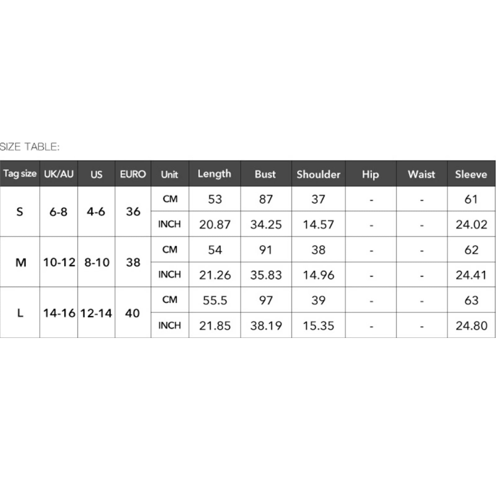 M Length: 54 Bust: 91 Sleeve: 62 Shoulder: 38